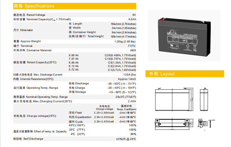 极限环境温度范围:充电 0~40℃,放电-20~55℃,贮存-15~50℃。