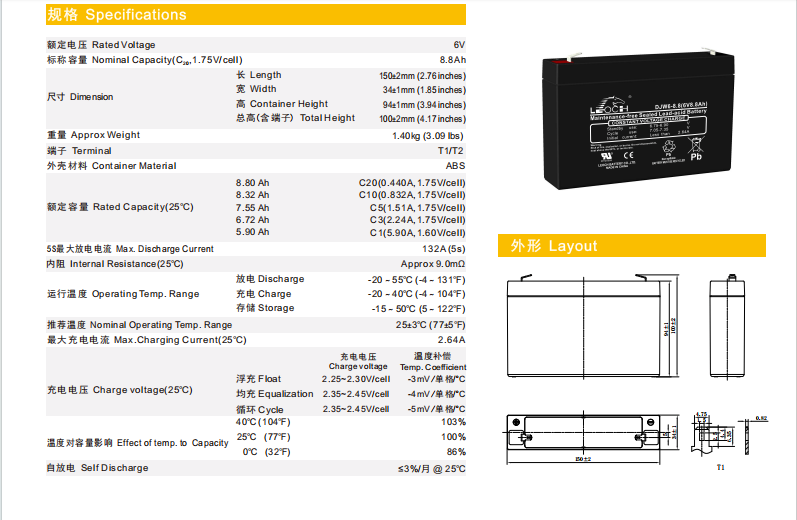 ※极限环境温度范围:充电 0~40℃,放电-20~55℃,贮存-15~50℃。
