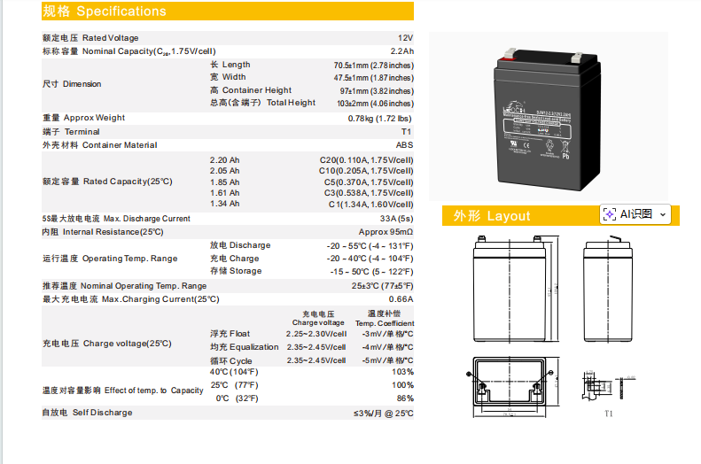 极限环境温度范围:充电 0~40℃,放电-20~55℃,贮存-15~50℃。