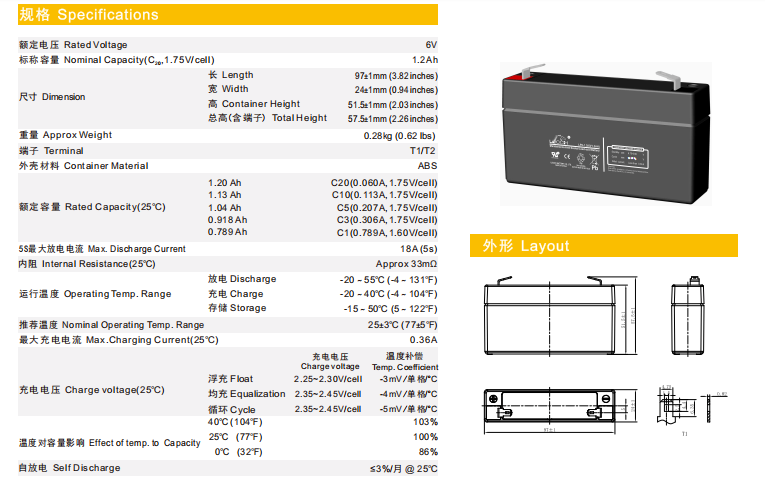 理士蓄电池 DJW6-1.2 (6V1.2AH)