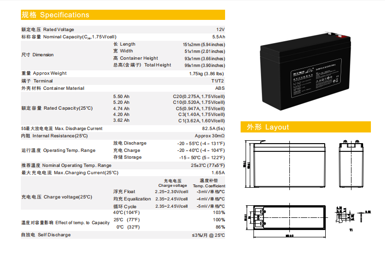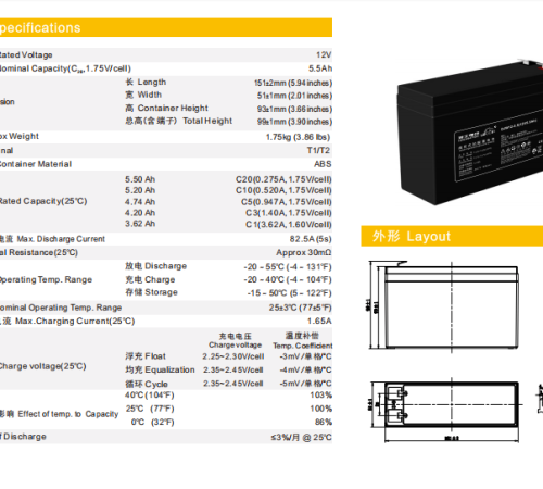 极限环境温度范围:充电 0~40℃,放电-20~55℃,贮存-15~50℃。