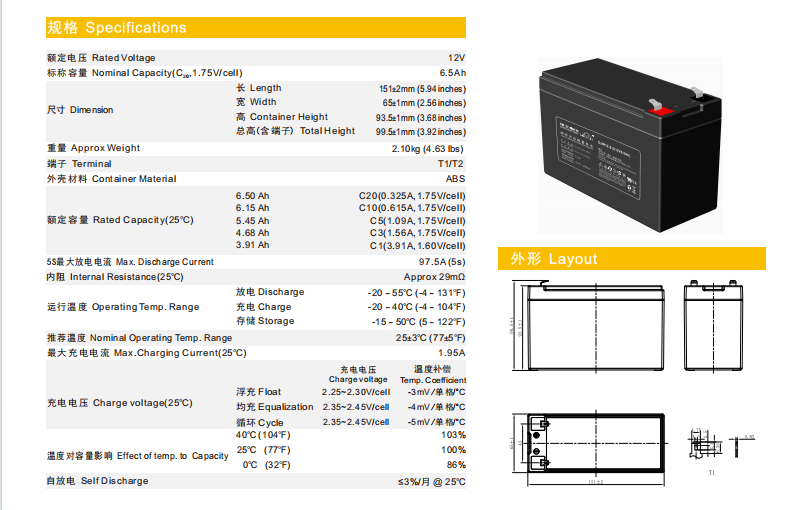 极限环境温度范围:充电 0~40℃,放电-20~55℃,贮存-15~50℃。