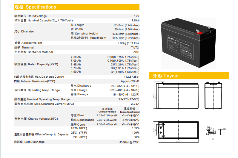 极限环境温度范围:充电 0~40℃,放电-20~55℃,贮存-15~50℃。