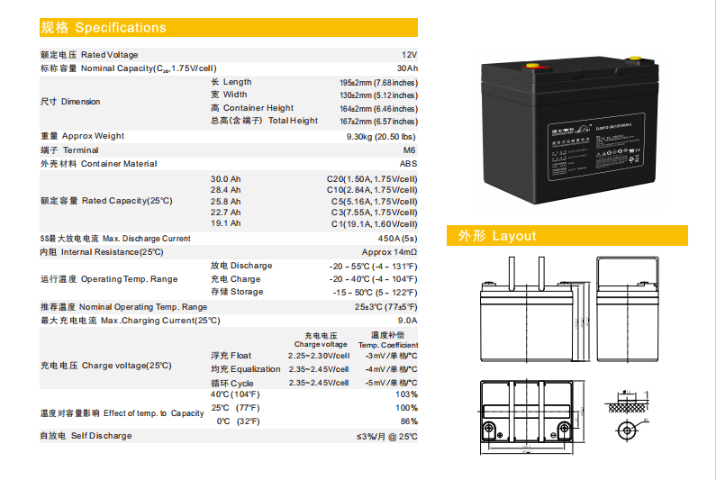 品牌:LEOCH理士蓄电池型号:DJW12-30S(12V30Ah)尺寸:195*130*164mm理士蓄电池DJW12-30S(12V30Ah)理士蓄电池用途:•通信 Telecommunications • 储能、电力 Energy Storage、Electric Systems• 应急电源、直流电源 Emergency Power Supply、 DC Power Supply • 医疗、