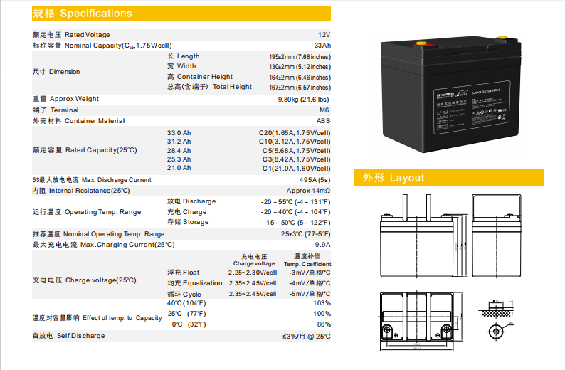 品牌:LEOCH理士蓄电池型号:DJW12-33S(12V33Ah)尺寸:195*130*164mm理士蓄电池DJW12-33S(12V33Ah)理士蓄电池用途:•通信 Telecommunications • 储能、电力 Energy Storage、Electric Systems• 应急电源、直流电源 Emergency Power Supply、 DC Power Supply • 医疗、